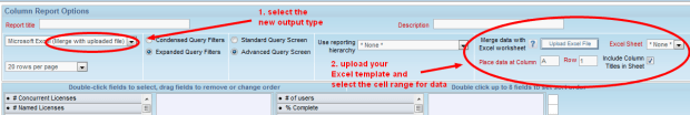 When creating a new column report, users can now choose “Microsoft Excel (Merge with uploaded file)” as their output type. They are then prompted to upload an existing Excel report template, and to identify the sheet and range of cells that should be populated with the raw data from ExtraView. All of the other sheets and calculations can then reference that data sheet and cell range to use as the data source for charts and tables in the report.