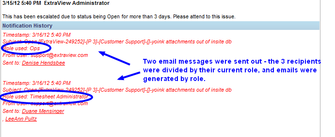 Standard ExtraView email notification is generated by role. Based on the mailing list of users to be notified, we identify the current role of each recipient, and create an email message for each needed role. In this way, we ensure that each recipient receives an email that matches the security permissions for field visibility, of their current role.